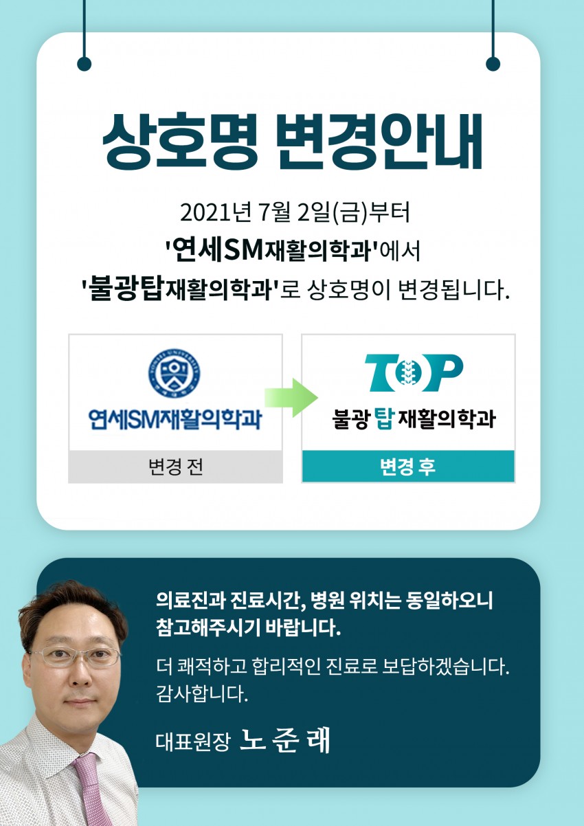 상호명 변경 안내 ( 연세SM 재활의학과 ▶ 불광탑 재활의학과 ) 페이지 정보 작성자 연세SM 작성일 21-07-02 17:07 조회7,331회 댓글0건 관련링크 이전글 다음글 목록 본문 .